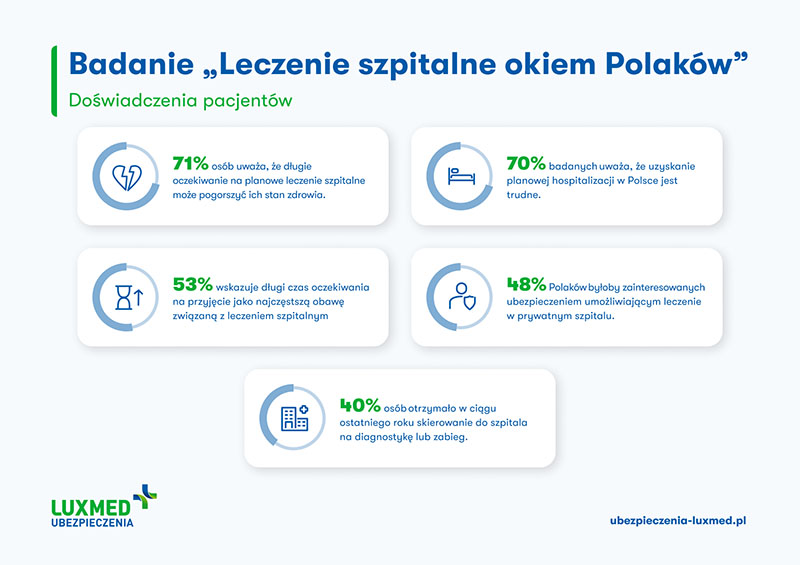 Aż 71% uczestników styczniowego badania „Leczenie szpitalne okiem Polaków” przeprowadzonego dla Grupy LUX MED uznało, że w czasie oczekiwania na leczenie ich stan zdrowia może się znacząco pogorszyć. Blisko połowa ankietowanych wyraziła zainteresowanie ubezpieczeniem szpitalnym, pozwalającym na leczenie w prywatnym szpitalu.