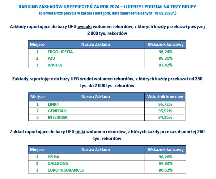 – Serdecznie gratuluję uczestnikom naszego rankingu, a szczególnie jego liderom w każdej z grup. Wiem, że pozycja w rankingu to efekt ciężkiej pracy ubezpieczycieli i konsekwentnych wspólnych starań nad jakością danych, będących cennym rynkowym aktywem. Wszyscy rozumiemy wagę jakości danych dla całego rynku ubezpieczeń komunikacyjnych w Polsce, a nam jest szczególnie miło, że możemy promować ranking i jego liderów – powiedziała Małgorzata Ślepowrońska, prezeska zarządu UFG.