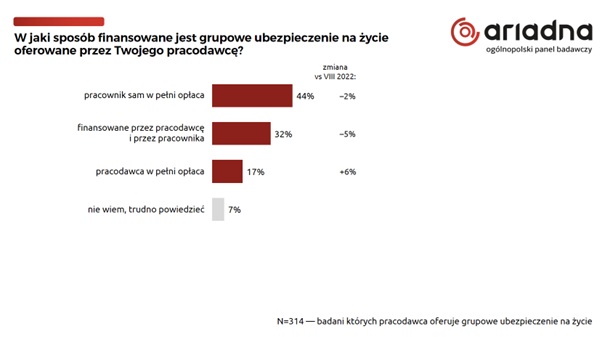 Z drugiej jednak strony 46% ankietowanych ma możliwość przystąpienia do grupowego ubezpieczenia na życie w swoim miejscu pracy. W przypadku 44% pokrycie kosztów takiego ubezpieczenia w całości spoczywa po stronie pracownika. Eksperci Unum zauważają, że w porównaniu do edycji z 2022 roku widać zmianę – coraz więcej pracodawców decyduje się na pełne finansowanie umowy grupowej. Odsetek takich firm wzrósł o 6 punktów procentowych, co oznacza, że obecnie niemal 17% przedsiębiorstw oferuje pracownikom bezpłatne uczestnictwo w „grupówce”.