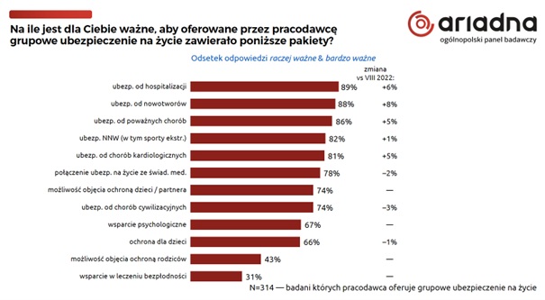 Dla 89% respondentów kluczowe jest, aby grupowe ubezpieczenie na życie obejmowało ochronę na wypadek hospitalizacji, 88% wskazało na konieczność wsparcia w przypadku nowotworów, a 86% oczekuje zabezpieczenia na wypadek poważnych chorób.