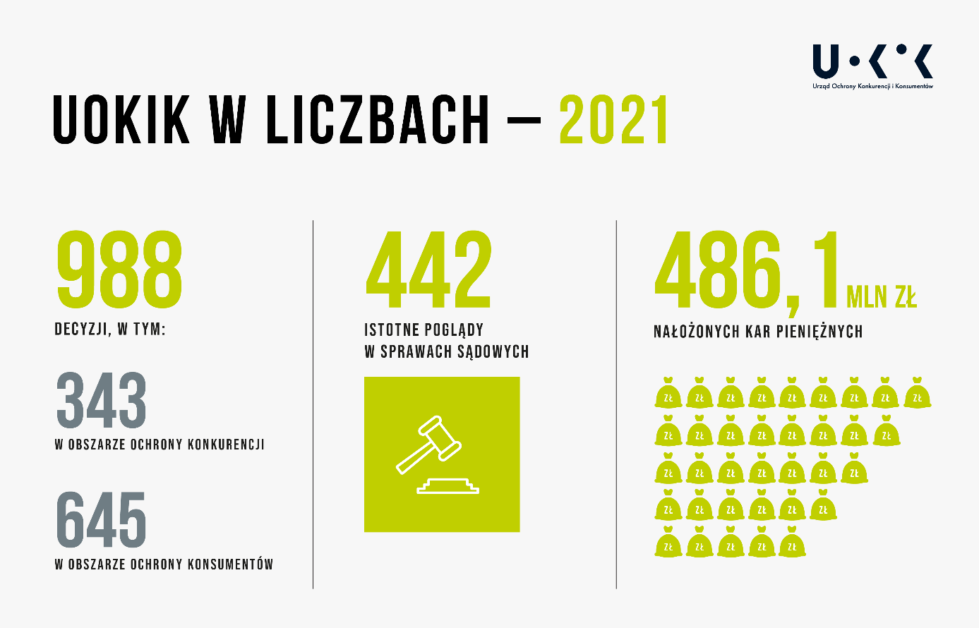 W 2021 roku prezes UOKiK wszczął m.in. 49 postępowań w sprawie praktyk naruszających zbiorowe interesy konsumentów oraz dotyczących uznania postanowień wzorca umowy za niedozwolone, a także 171 postępowań wyjaśniających. Wydał 59 decyzji, w których nałożył łącznie 153,8 mln zł sankcji pieniężnych. Urząd podejmował liczne działania miękkie: wystosował 408 wystąpień do przedsiębiorców o zmianę praktyki. Ponadto 442 razy wydał istotny pogląd w sprawie dla osób walczących o swoje prawa w sądzie.