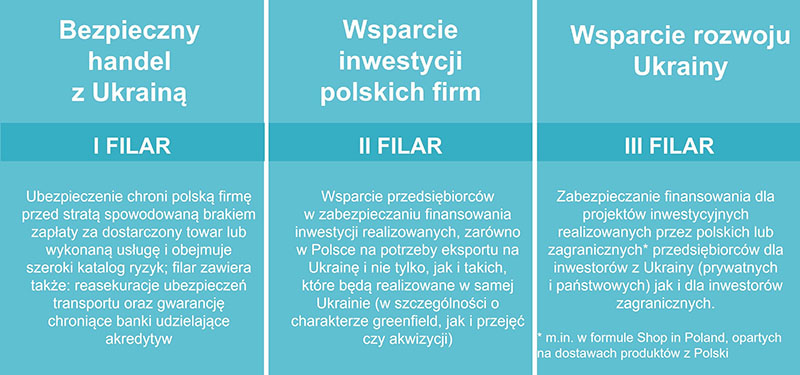 – Nasza aktywność w tym obszarze ma trzy filary. Pierwszy obejmuje prowadzoną cały czas działalność eksportową polskich firm, czyli ubezpieczamy sprzedaż towarów z odroczonym terminem płatności do kontrahentów w Ukrainie. Przez 1,5 roku byliśmy jedyną agencją wsparcia eksportu, która oferowała ubezpieczenie ukraińskiego rynku, i szło nam to bardzo dobrze – powiedział Janusz Władyczak.