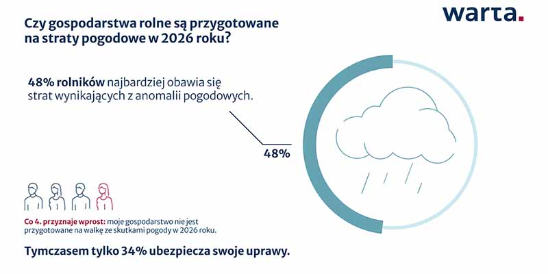 Z najnowszego badania przeprowadzonego przez Fieldstat na zlecenie Warty wynika, że anomalie pogodowe stały się największym wyzwaniem dla polskiej wsi. Połowa ankietowanych rolników wskazuje je jako swoje główne zmartwienie w nadchodzącym sezonie. Co czwarty deklaruje, że nie jest przygotowany do radzenia sobie ze stratami pogodowymi w 2026 r.