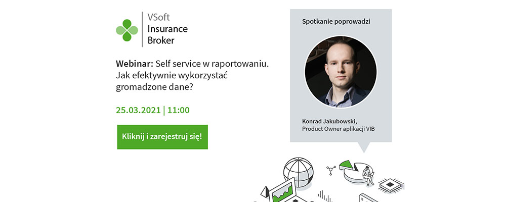 Podczas spotkania prowadzący je Konrad Jakubowski, Product Owner aplikacji VSoft Insurance Broker, wyjaśni, czym jest rozwiązanie Self service oraz dlaczego wybrano je w aplikacji VIB. Przedstawi też praktyczne zastosowanie rozwiązania oraz możliwości modułu raportowania aplikacji VSoft Insurance Broker.