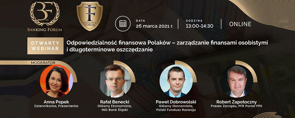 Webinarium, będące integralną częścią Spotkania Liderów Bankowości i Ubezpieczeń 2021, rozpocznie się o godzinie 13:00. W panelu weźmie udział Robert Zapotoczny, prezes PFR Portal PPK, Paweł Dobrowolski, główny ekonomista PFR, Rafał Benecki, główny ekonomista ING Bank Śląski oraz dziennikarka Anna Popek w roli moderatorki. Uczestnicy podejmą tematy istotne dla osób, które chcą zarządzać swoimi finansami w sposób bezpieczny i efektywny.