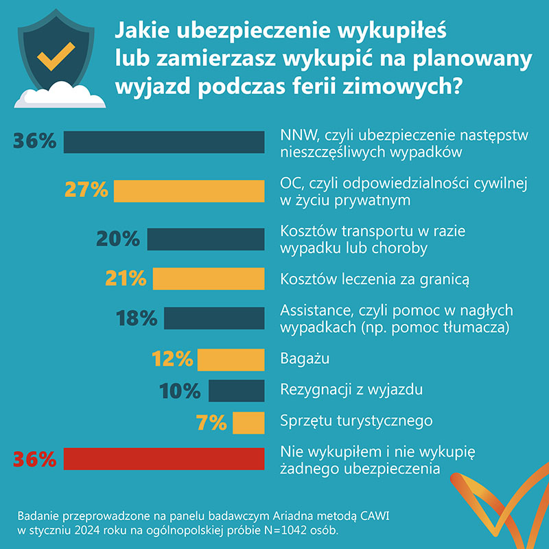 W ubiegłorocznej odsłonie badania nabycie ubezpieczenia zadeklarowało 61% ankietowanych. W tym roku odsetek ten wzrósł do 64%. Najwięcej – 36% badanych – zdecydowało się na NNW (31% w 2023 r.). Z kolei 27% wykupiło OC w życiu prywatnym, co jest wynikiem o 6 pp. lepszym niż przed rokiem. 20% zadba o ubezpieczenie kosztów transportu w razie wypadku lub choroby, a co piąty wykupi ubezpieczenie kosztów leczenia za granicą.