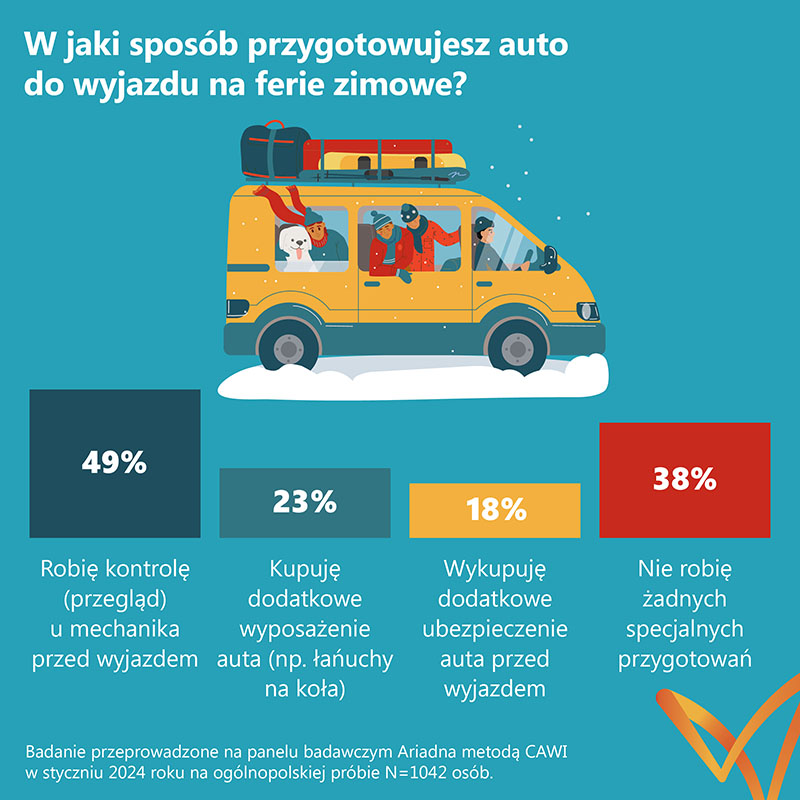 Badani, którzy planują podróżować autem, przygotowują je na zimowy wyjazd w różny sposób. Najczęściej przed ruszeniem w drogę robią kontrolę u mechanika (50% wskazań). W zeszłorocznej edycji badania przegląd u mechanika zadeklarowało 38% respondentów. 23% kupuje dodatkowe wyposażenie auta, np. łańcuchy na koła (20% w 2023 r.), a 18% nabywa dodatkowe ubezpieczenie auta przed wyjazdem (+4 pp. r/r). Natomiast 38% nie robi żadnych specjalnych przygotowań.