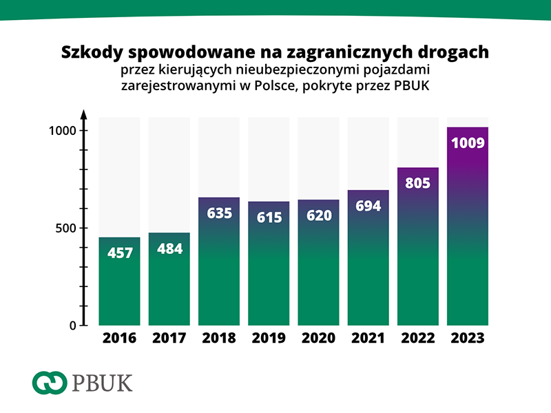 Znacząco wzrosła liczba zdarzeń spowodowanych na zagranicznych drogach przez naszych kierujących bez ważnego OC ppm. W 2023 r. PBUK zarejestrowało aż 1009 nowych zgłoszeń dotyczących tego rodzaju szkód. Rok wcześniej odnotowano 805 takich zgłoszeń.